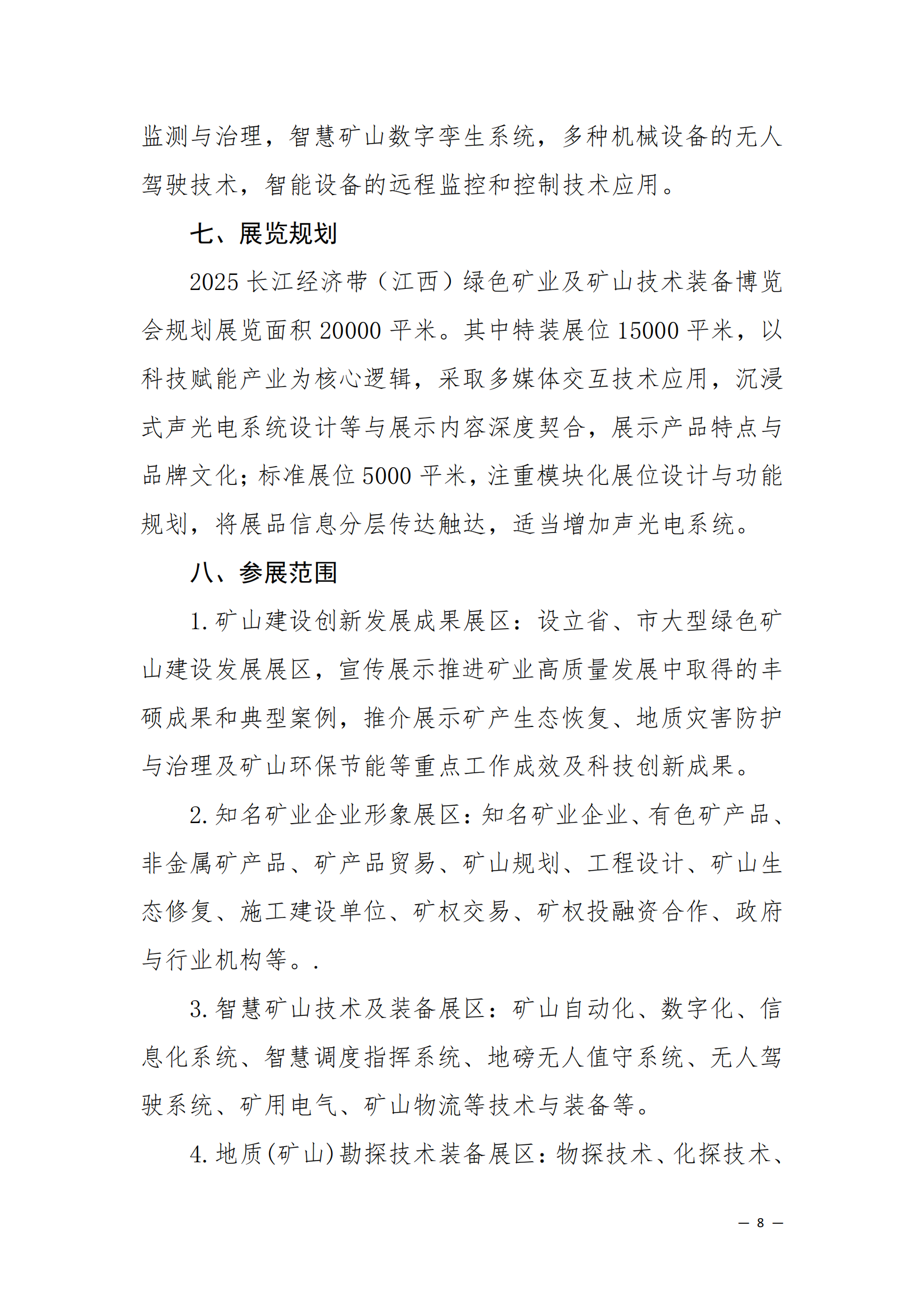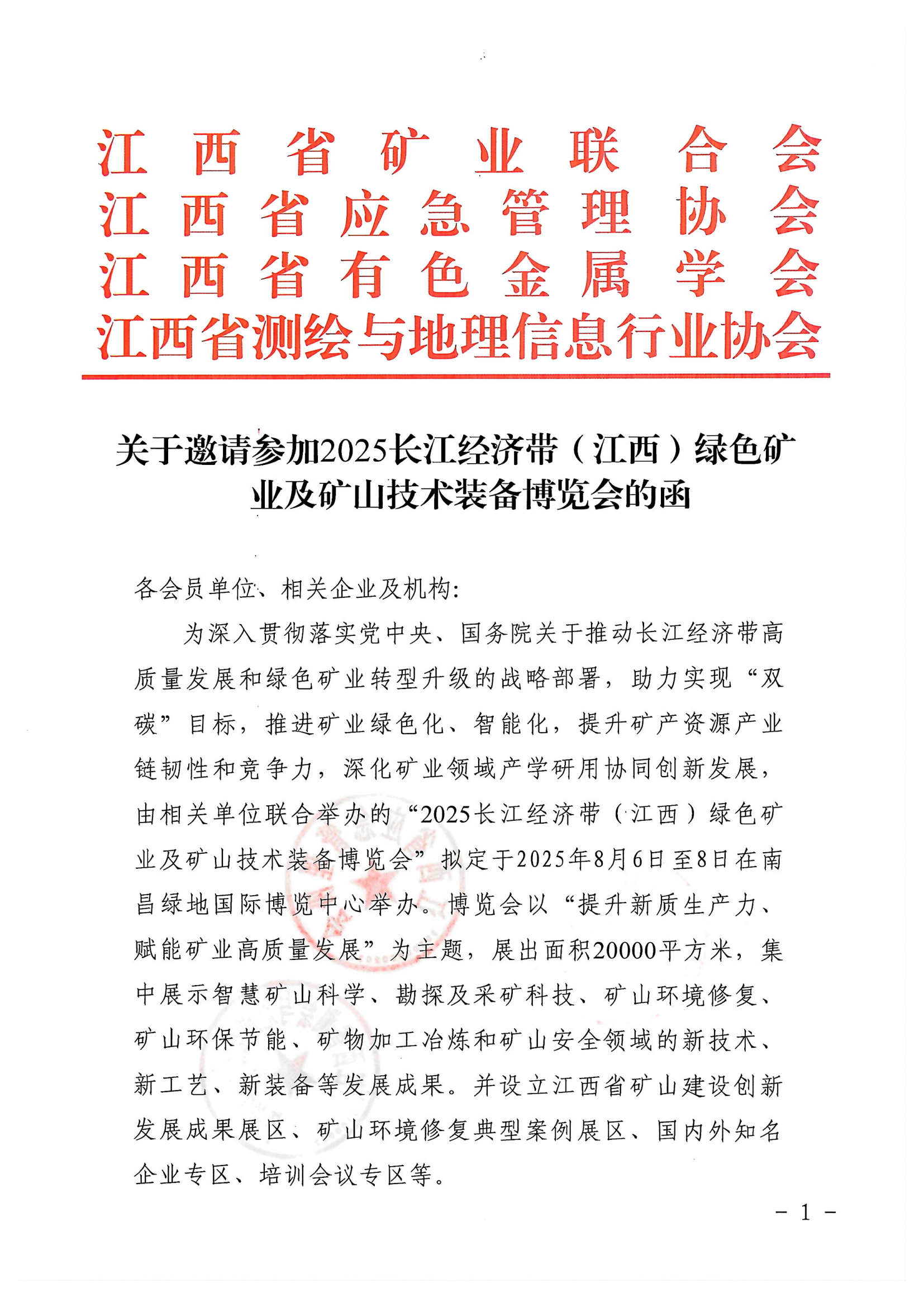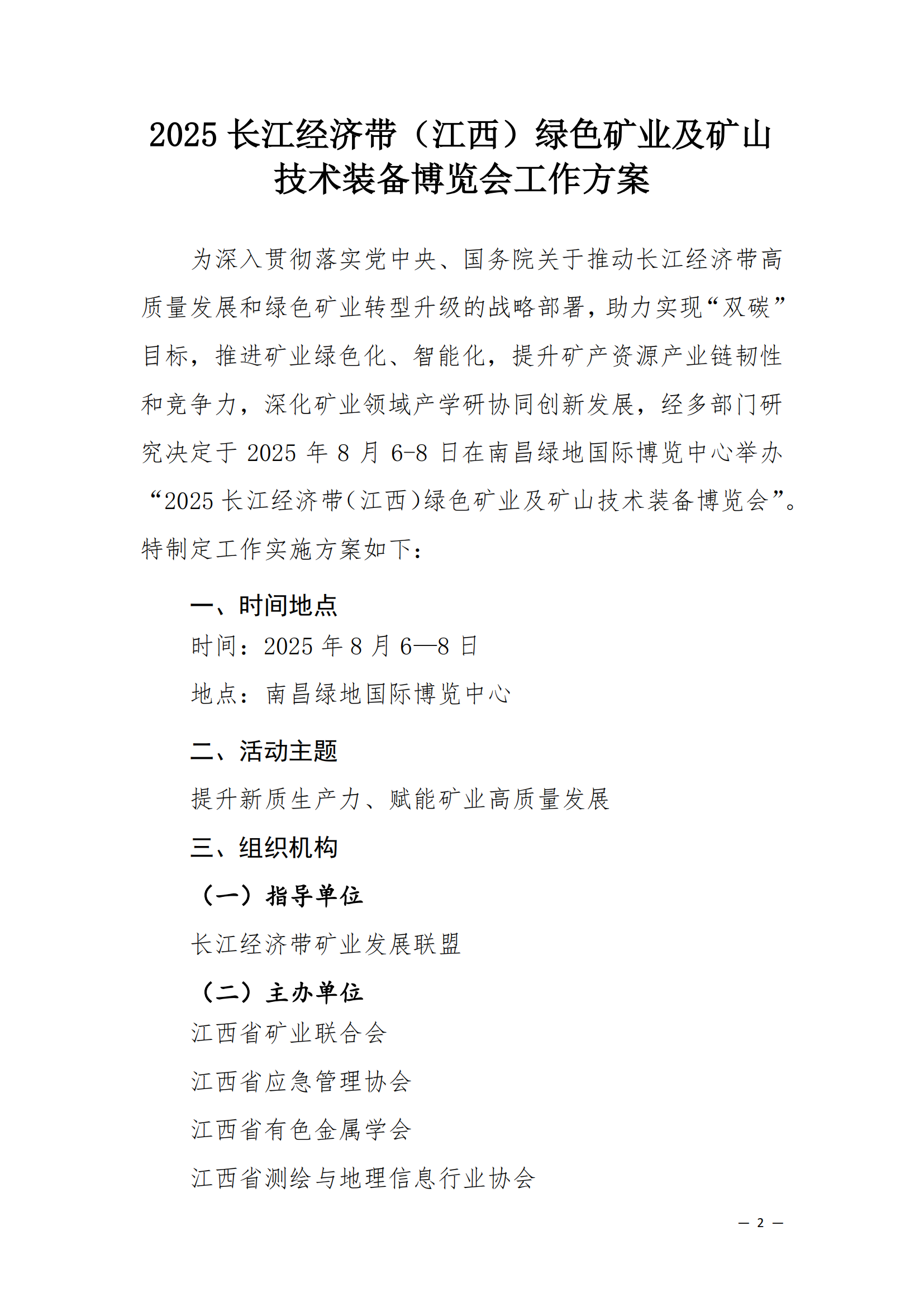 为贯彻习近平总书记对进一步推进长江经济带高质量发展做出的重要指示,落实总书记“加强矿产资源勘探开发增储上产,保障国家资源能源战略安全”一系列重要指示批示精神,大力开展技术装备创新,推进产业绿色化、智能化发展,提升矿产资源产业链韧性和竞争力。按照江西省委十五届四次、五次全会部署要求,围绕打造“三大高地”、实施“五大战略”,进一步提升矿产资源开发、利用、保护及管理水平;为促进江西省矿业产业健康发展、推进绿色矿山建设、提升矿产资源保障能力、加强生态环境保护,经多部门研究决定于2025年8月6-8日在南昌绿地国际博览中心举办“2025长江经济带(江西)绿色矿业及矿山技术装备博览会”。